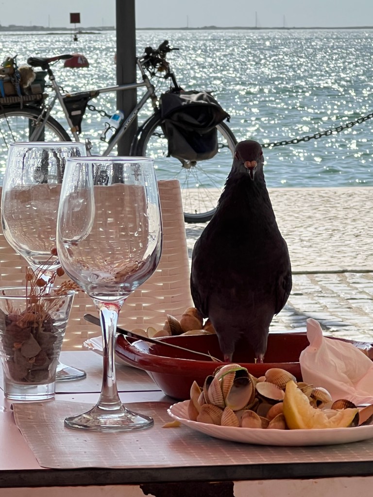 nachdem die Gäste am Nachbartisch gegangen waren kam eine Taube und hat sich um die Reste gekümmert.