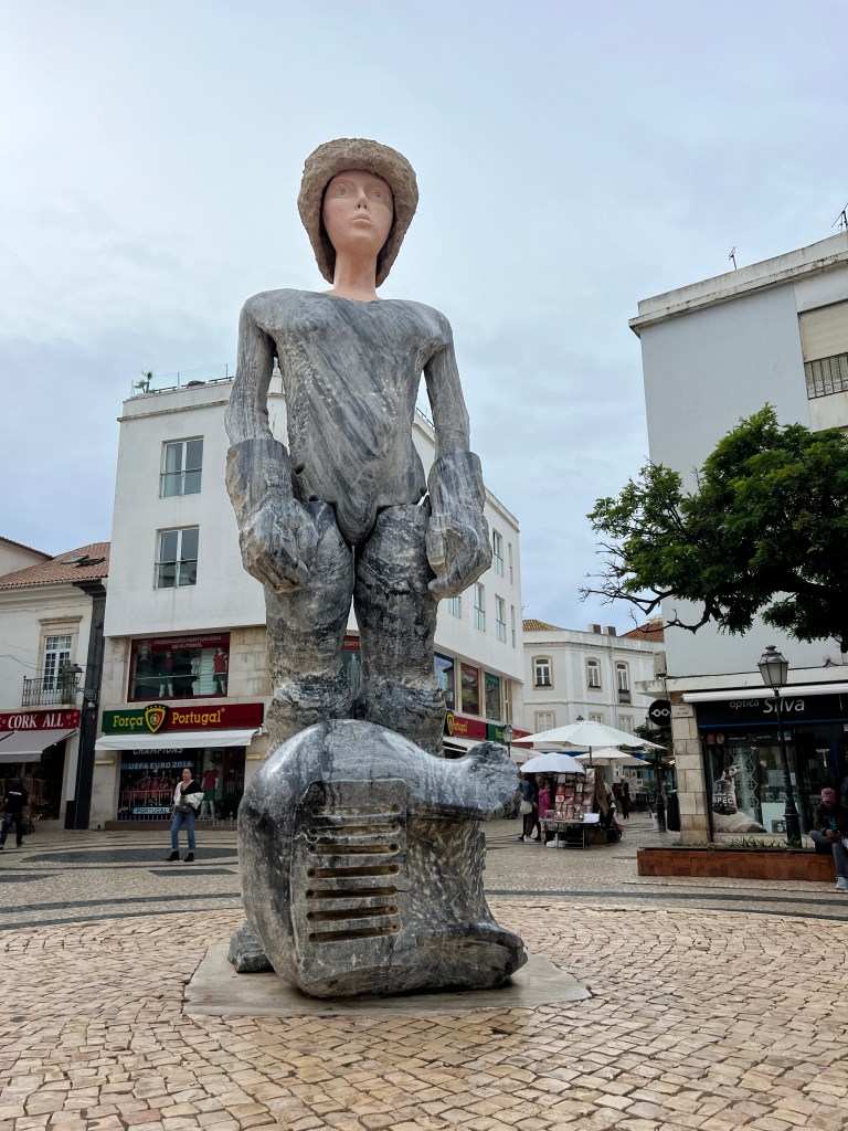 In Lagos steht auch diese Figur die ein bißchen aussieht wie ein Ritter aus der Zukunft. Tatsächlich ist es das Denkmal für einen portugiesischen König aus dem 16. Jahrhundert der sehr geliebt worden ist vom Volk. 1973 wurde diese Statue aufgestellt, der Künstler wollte ein Zeichen setzen, und setze den König nicht in Bronze gegossen auf ein Pferd, sondern realisierte diese Statue.